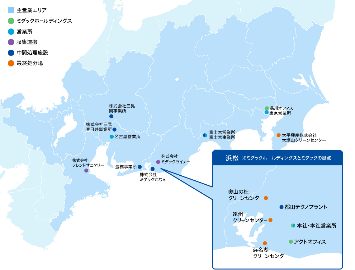 グループ全体を支える基幹拠点。地域に深く根差し、水処理・焼却・埋立まで多彩な提案を行う、ミダックの精神を体現する象徴的な営業拠点です。